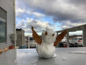 畑の野菜も寒そう。建物に入ろうとすると、雪だるまが出迎えてくれました。寒いけれど、ほっこりする朝でした。