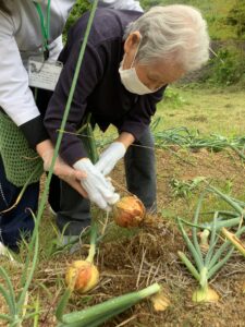 デイの利用者さんに「玉ねぎの茎が倒れたらいいタイミング」と教えてもらい、早速収穫。