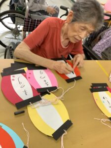 今、ちょうちん作りを入居者さんに手伝ってもらっています。