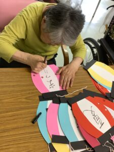 今、ちょうちん作りを入居者さんに手伝ってもらっています。