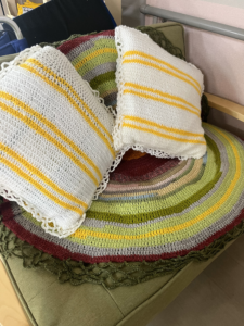 面会用に使う1階のソファーの編み物はすべてAさんの作品です。