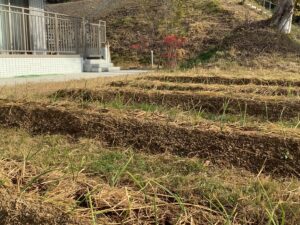 寒さをしのげるようにと、真ん中にわらをしき上に腐葉土をまきました。