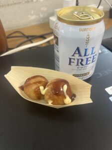 屋台の気分も味わってもらおうと、たこ焼きとノンアルでおやつ。