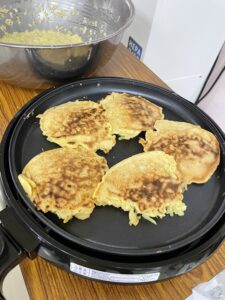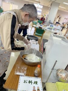 お好み焼きの生地、シーフードミックス、天かすの中に玉子を割って焼きます。